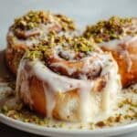 These White Chocolate Pistachio Cinnamon Rolls combine classic cinnamon-sugar swirls with crunchy pistachios and a luscious white chocolate ganache topping. Perfect for a sweet breakfast or indulgent dessert, these rolls feature a tender, fluffy dough enriched with butter and milk, layered with a spiced cinnamon-pistachio filling, and finished with creamy ganache and extra nuts for texture.