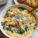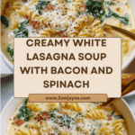 This creamy and comforting White Lasagna Soup combines crispy bacon, tender rotini pasta, and a blend of ricotta, mozzarella, and Parmesan cheeses in a savory broth flavored with garlic, onion, and Italian herbs. Finished with fresh spinach and garnished with parsley or basil, this quick and easy soup delivers all the flavors of classic lasagna in a cozy bowl.